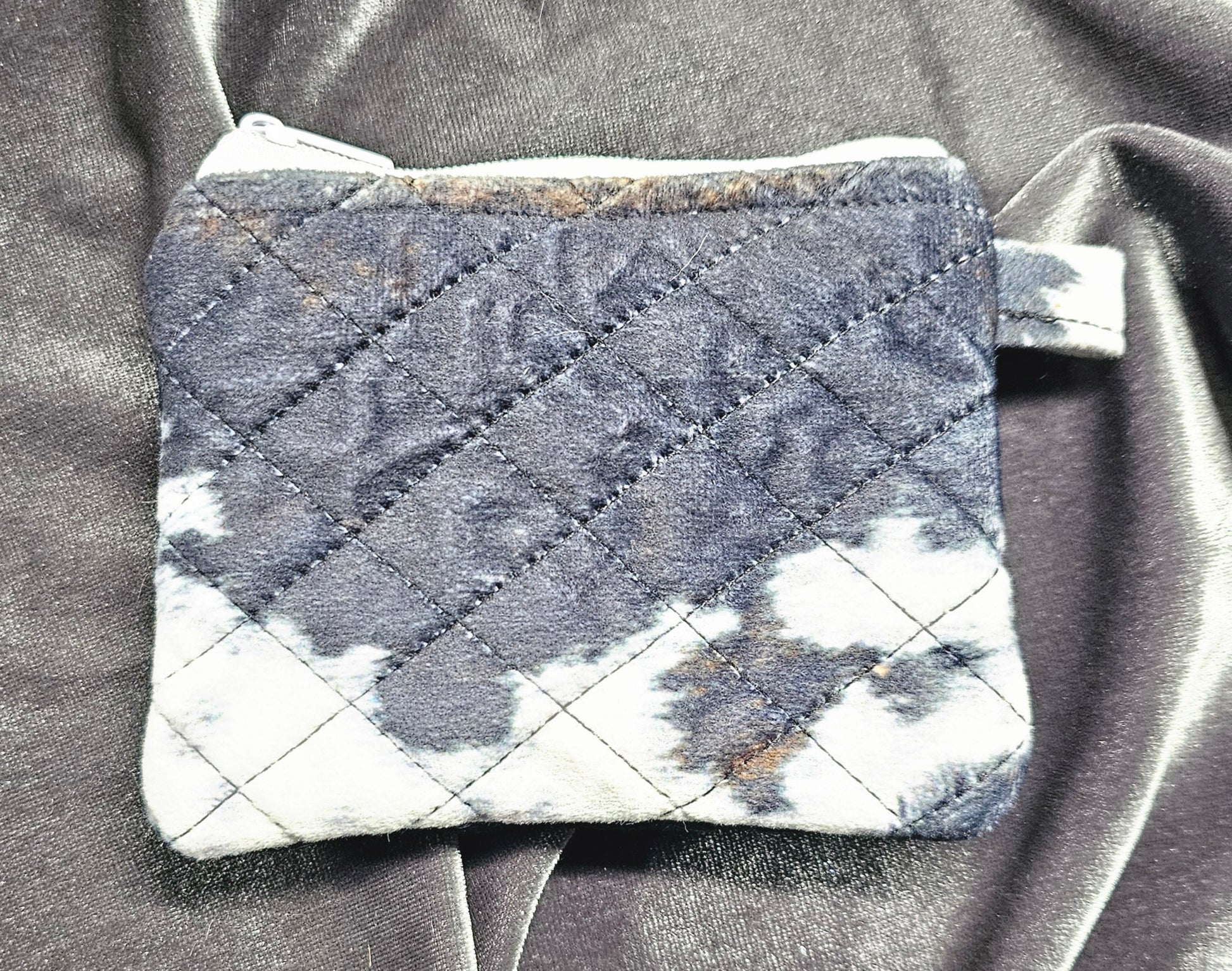 The cutest handcrafted and quilted coin purse is the perfect useful addition! This abstract animal "faux fur" cowhide print fabric is made of polyester but has a suede feel that is soft to the touch. Single white zipper with inside white cotton fabric.