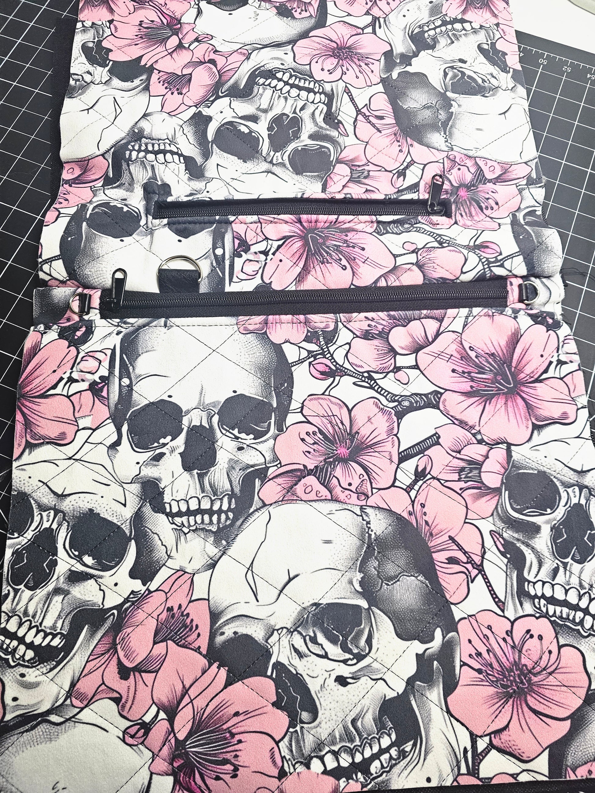 Handcrafted quilted skull with wildflowers crossbody. Fabric is made of polyester and has a velvet soft feel. This bag is hand quilted with an additional zip pocket on the outside; both zippers are black. The inside features 3 pockets made of cotton fabric in black with enough room to store personal items if you want to use this bag for cosmetics or dress it up by adding a strap for an everyday bag. The hardware is silver colored D rings to add a hand/shoulder strap, a keychain accent D ring is also sewn in.