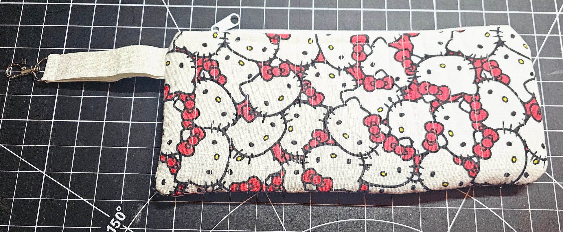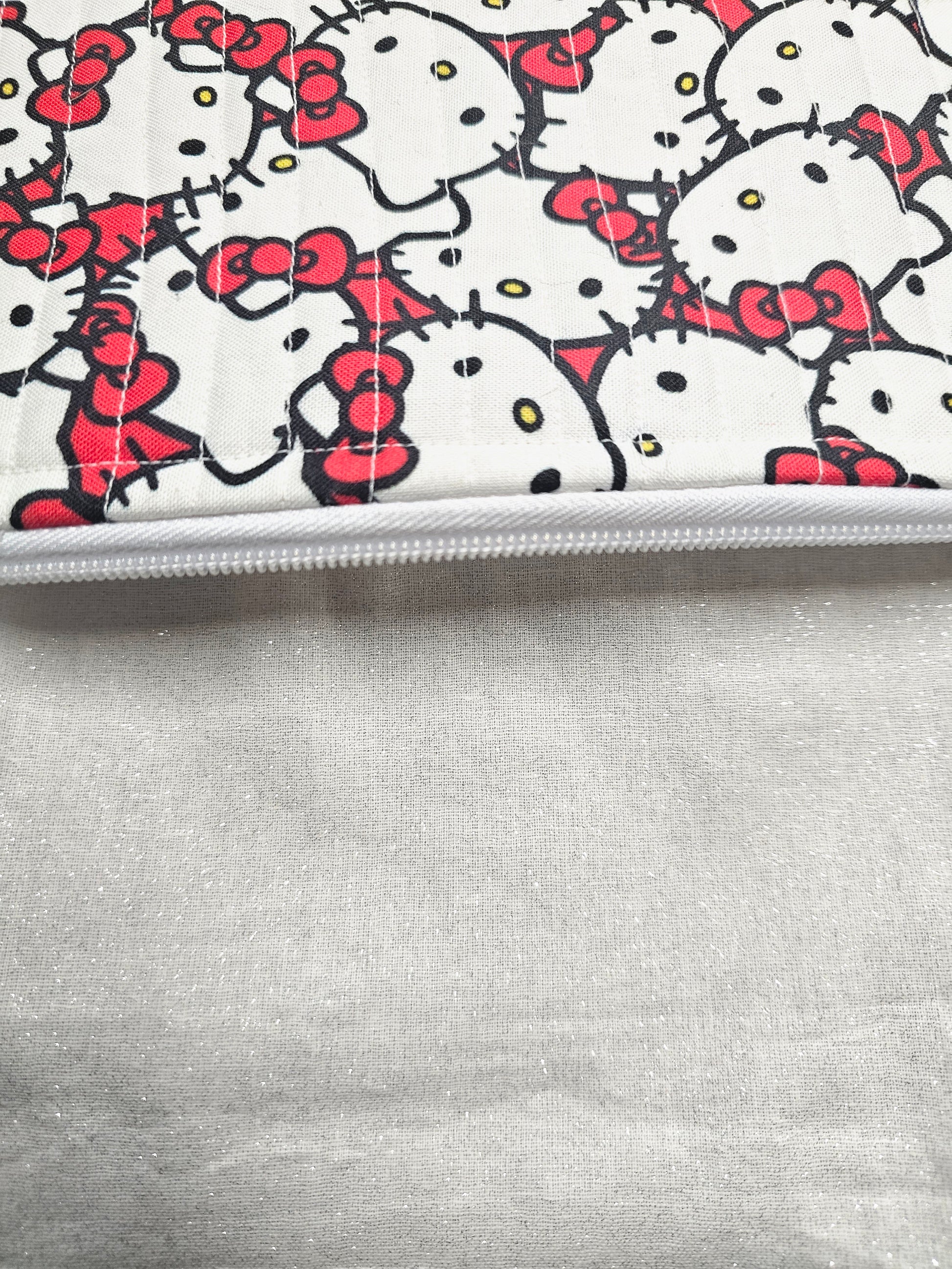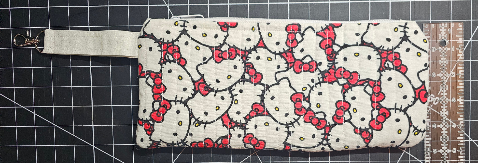 Cute Hello Kitty clutch is quilted with cotton fabric. The inside fabric is white with glitter cotton fabric; closure is a white zipper; outer handle has silver keychain hardware.