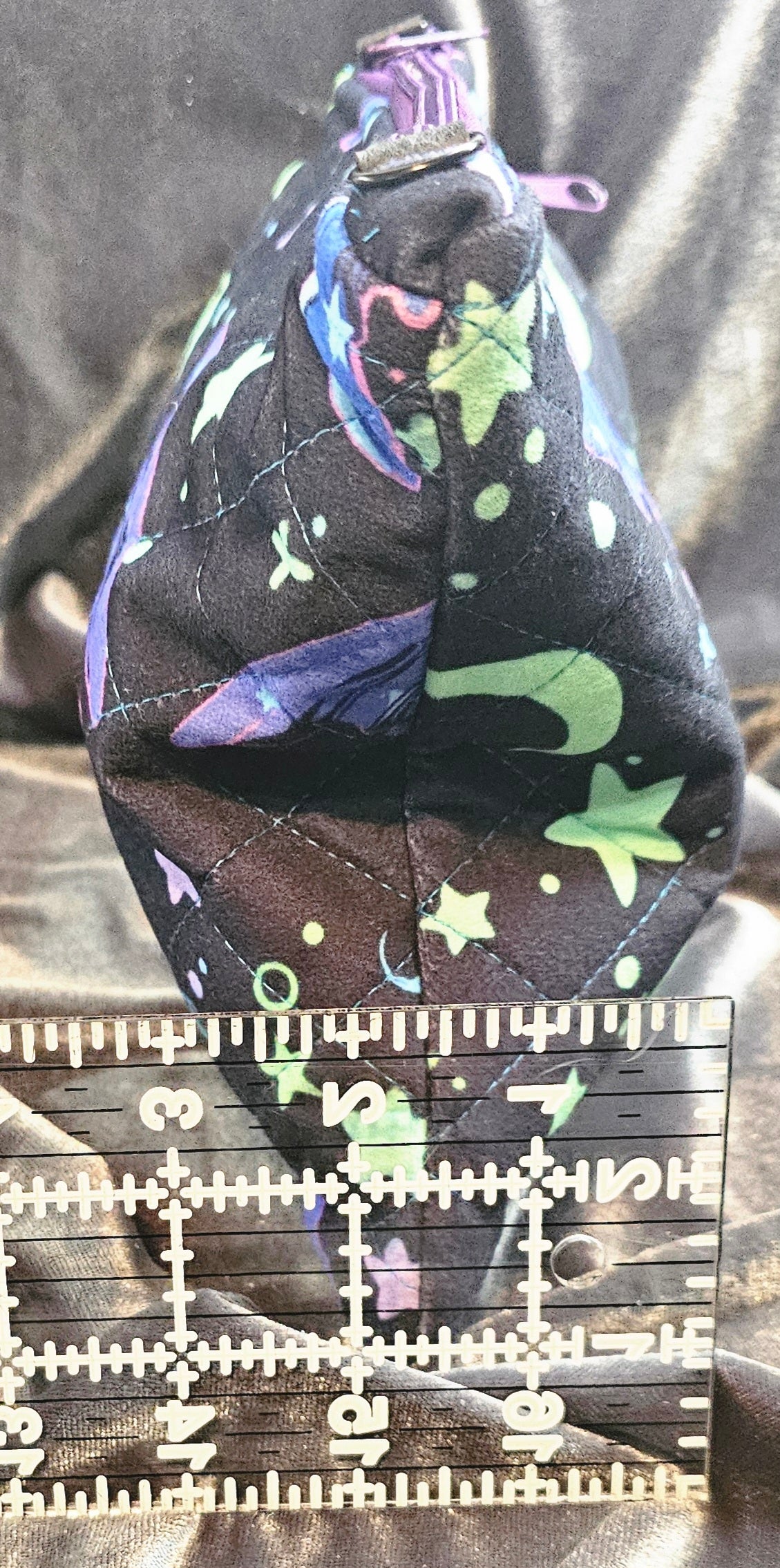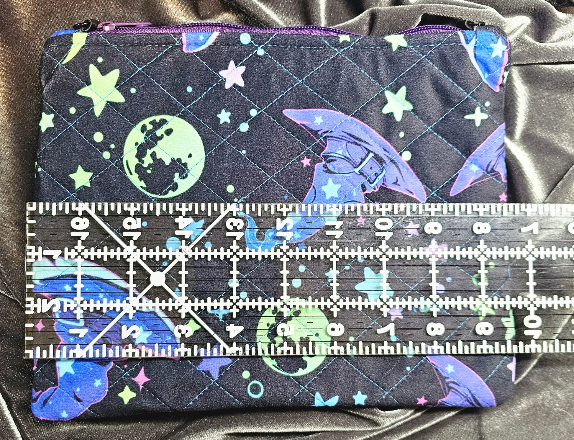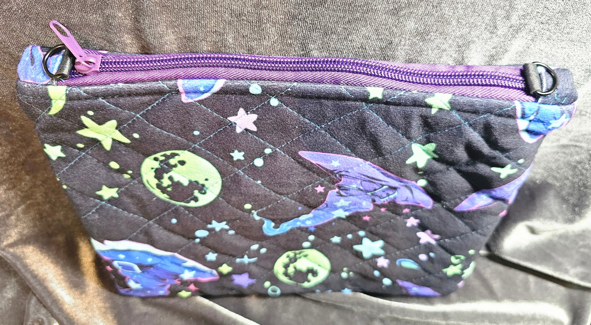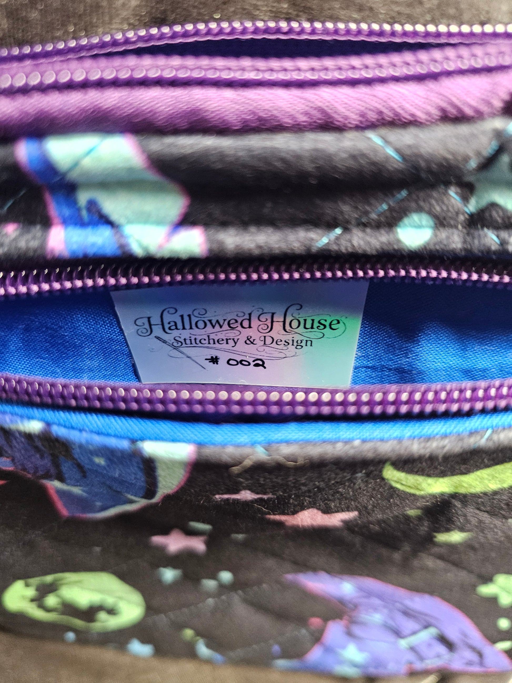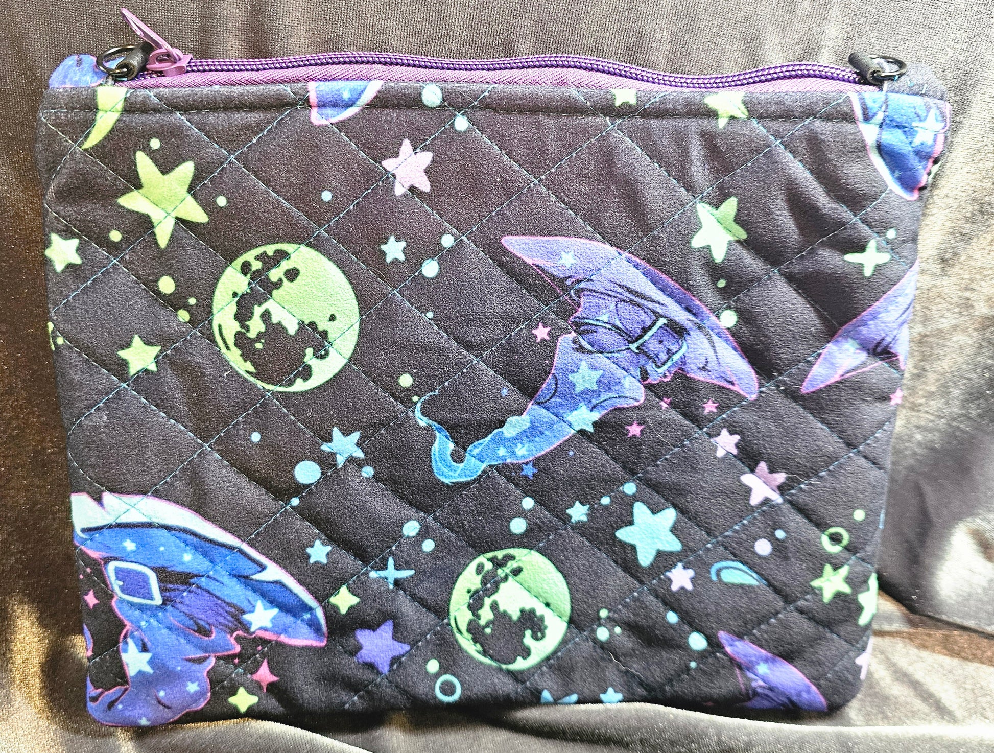 This Witchy fabric has a dreamy sort of tone to it, don't you think? This zip pouch is a smaller size in the material feature. Handmade and quilted from polyester fabric that is soft to the touch with a suede feel. It features two zip compartments that is lined with blue cotton fabric, closures are also purple zippers. This is the perfect crossbody or grab and go bag for the essentials, the hardware is secured by faux leather strapping with gun metal black loops to add crossbody strap or single hand strap.